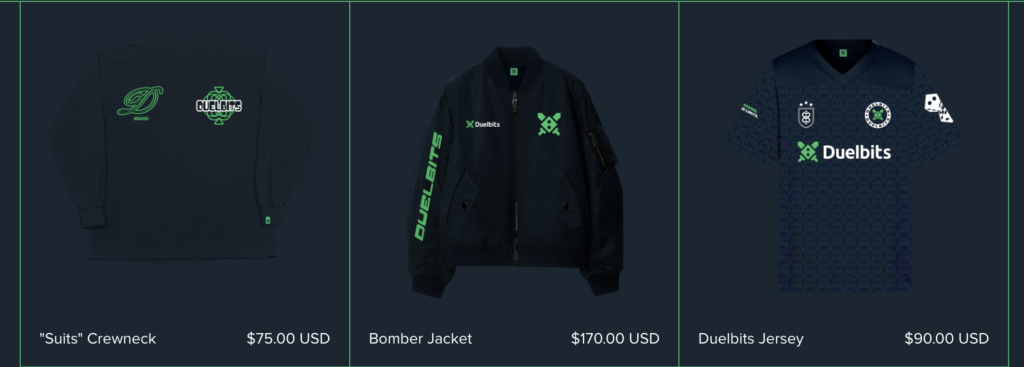 Duelbitsillä on myös oma tuotekauppa, jossa pelaajat voivat ostaa brändättyjä vaatteita ja asusteita. Tuotteet tunnetaan korkeasta laadustaan ja modernista muotoilustaan – monet pelaajat käyttävät niitä arjessa myös kasinon ulkopuolella. Tämä vahvistaa Duelbitsin yhteisölähtöistä brändi-identiteettiä ja tekee siitä enemmän kuin vain kasinon – se on elämäntyyli.